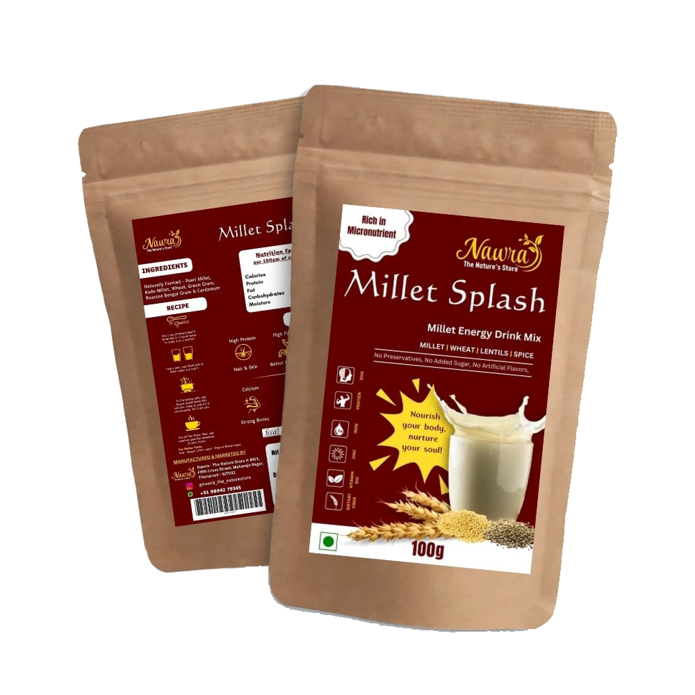 Millet Splash is an energizing drink mix designed with the motto, “Nourish your body, Nourish your soul!” This premium beverage blend is a powerhouse of millet-based functional nutrition, crafted to enhance your immune system and fulfill your body’s daily micronutrient needs.